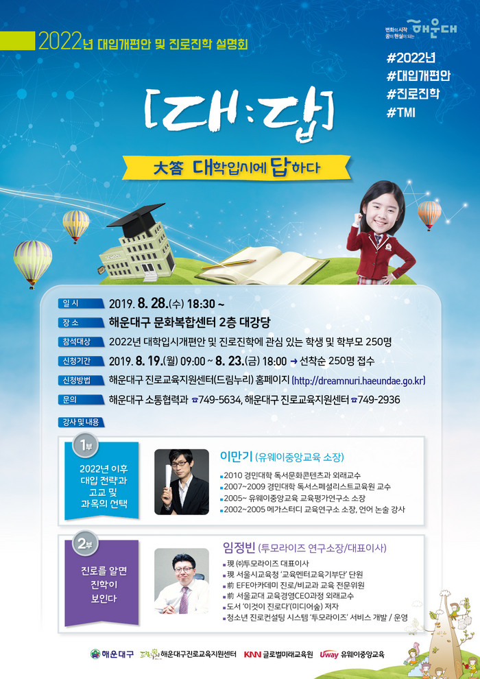 오는 28일 오후 6시 30분부터 해운대구 문화복합센터 2층 대강당에서 진행되는 이번 설명회는 ‘대:답=大答(대학입시에 답하다)’을 주제로 학생들과 학부모들에게 다가올 2022년 대입에서의 개편안과 그에 따른 진로진학에 대해 궁금증을 해소해 줄 예정이다.