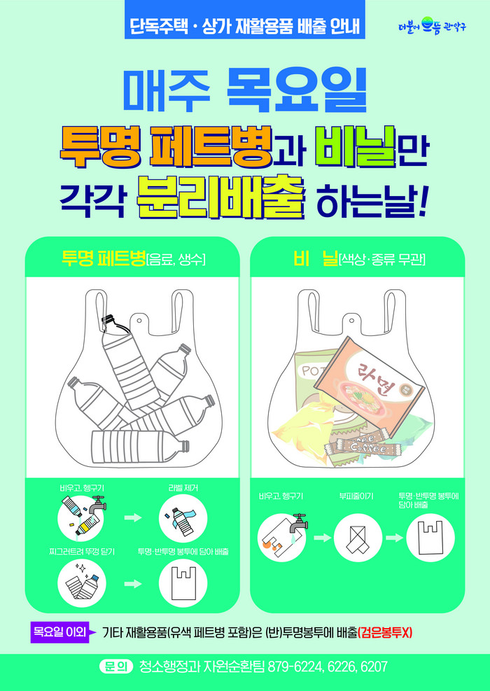 [로컬세계 임종환 기자]관악구(구청장 박준희)가 오는 25일부터 단독주택과 상가지역을 대상으로 투명페트병·폐비닐 분리배출 요일제를 전면 시행한다고 24일 밝혔다.