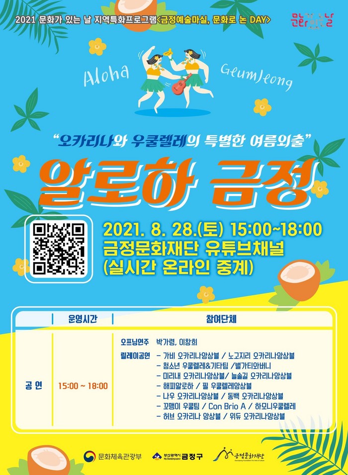 이번 행사는 ‘알로하 금정’을 부제로 오카리나 연주자와 우쿠렐레 동호회의 릴레이 공연으로 구성되며, 코로나19 확산세를 고려해 금정문화재단 유튜브 채널(https://youtu.be/8g87E93TcRs)을 통해 온라인 중계된다.