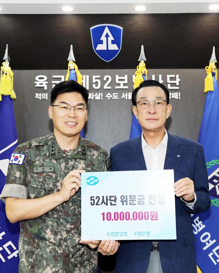 ▲노동진 수협중앙회장(오른쪽)이 6일 경기도 광명시에 위치한 육군 제52사단 본부에서 이우헌 소장(왼쪽)에게 위문금을 전달하고 기념사진을 찍고 있다. |