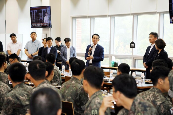 ▲노동진 수협중앙회장(가운데 마이크)이 6일 경기도 광명시에 위치한 육군 제52사단 본부에서 이날 제공된 수산물 특식을 설명한 뒤, 장병들을 격려하고 있다. 수협 제공 |