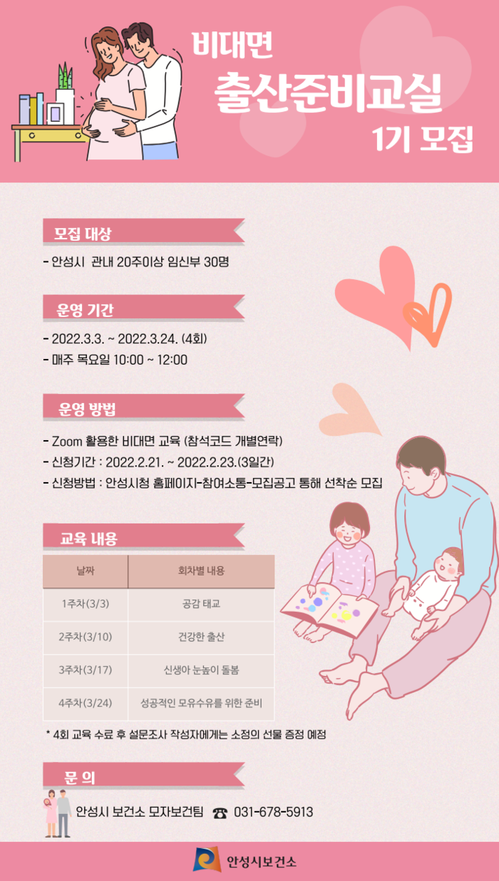 [로컬세계 김병민 기자]경기 안성시보건소는 코로나19 장기화로 임신, 출산, 육아에 대한 지식 공유가 어려운 임신부를 위해 오는 3월부터 출산준비교실을 시작한다고 14일 밝혔다.