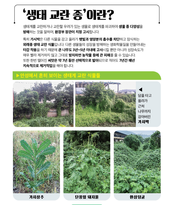 안성시도 민·관 합동으로 관내 생태계 교란생물의 발생 현황에 대한 지속적인 모니터링과 제거사업을 실시하고 있으나, 높은 관심과 투입예산 대비 효율이 낮고 지속적인 발생을 억제하지 못하는 실정이기에 본 공모사업이 추진됐다.