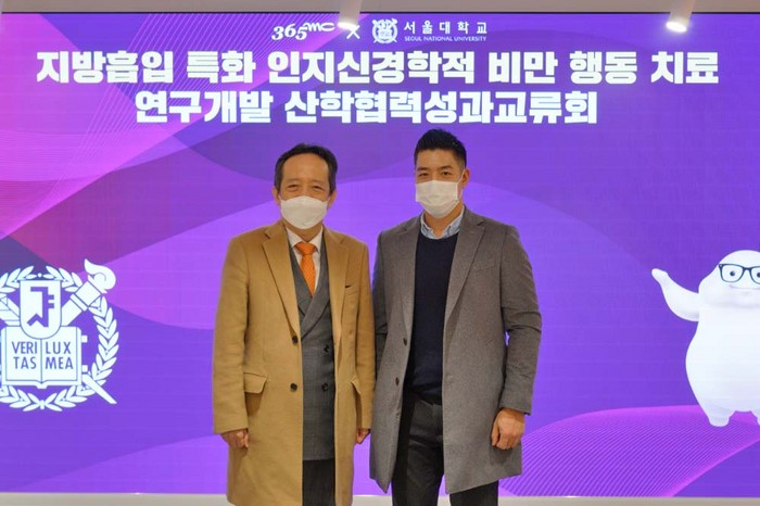 ▲365mc네트웍스 김남철 대표이사(왼쪽)와 서울대 심리학과 안우영 교수가 인지신경학적 비만 행동 치료 연구 성과 교류회를 지난달 25일 진행한 뒤 기념촬영을 하고 있다. [365mc 제공] |
