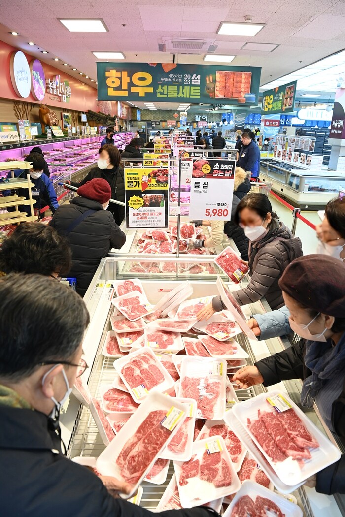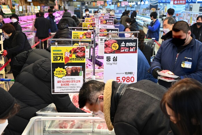▲ 9일(월) 서울시 서초구에 위치한 하나로마트 양재점에서 진행한 ‘한우 100마리! 파격 할인 행사’에 많은 고객이 몰려 인산인해를 이루고 있다. |