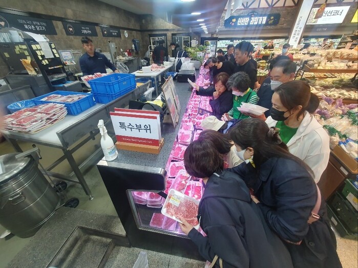 ▲ 한우 할인판매 첫날 시민들이 한우를 고르고 있다. 농협 제공 |