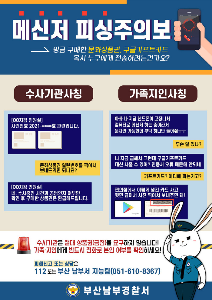이와 관련, 부산남부경찰서는 편의점을 상대로 이와 같은 피싱 사기를 방지하기 위해 관내 전 편의점을 상대로 수사기관 및 자녀를 사칭해 기프트 카드 구입 후 핀번호 전송을 요하는 피싱 범죄 유형별 사례를 전단지로 제작해 배포해 편의점 내 부착하고 편의점 직원들을 상대로 기프트카드 판매 전 손님이 피싱사기로 인해 구매하는 것이 아닌지 여부를 확인토록 하고 있다.