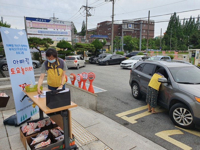 | ▲아빠랑 토요놀이터 방구석요리교실 꾸러미 배부 장면.(창원시 제공) |