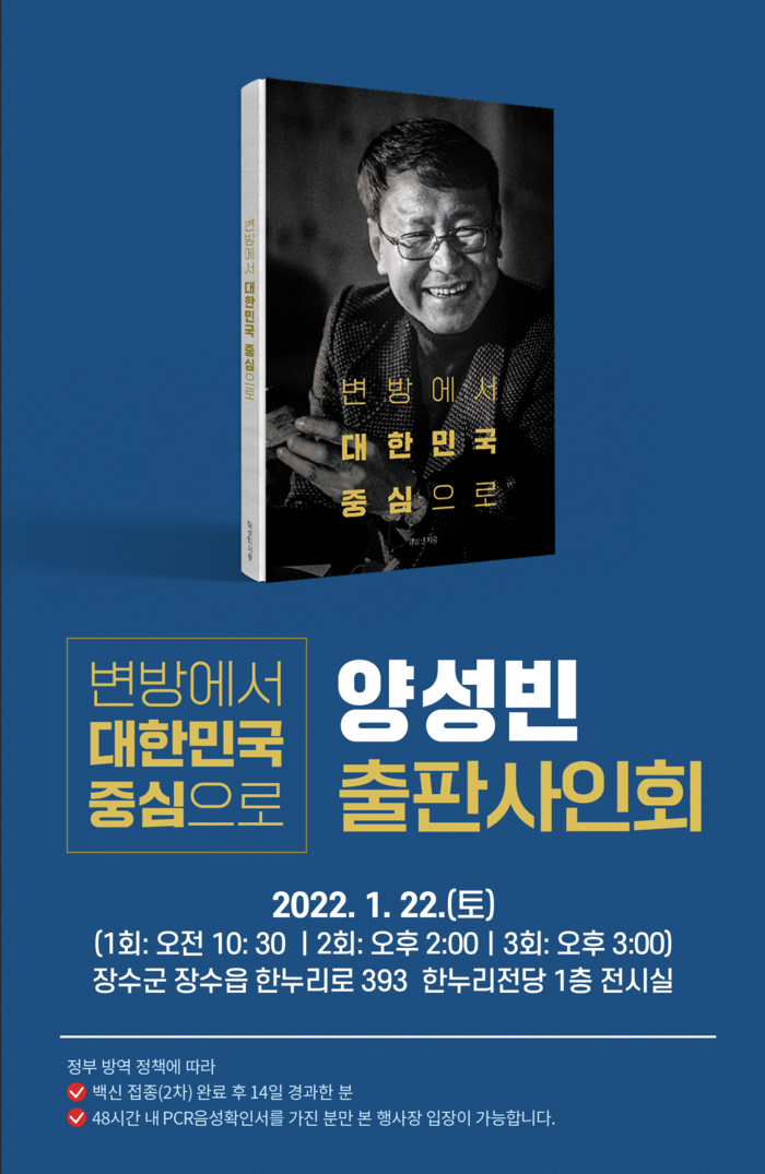 온라인 출판기념회는 유튜브 방송을 활용한 비대면 행사로, 양 전 의원의 성장과정과 정치 활동, 장수발전을 위한 비전 등 이야기보따리를 풀어내는 콘서트 형식으로 진행된다. 또 소멸위기에 직면해 있는 농업·농촌 문제 해결 방안과 제값 받는 농업 실현, 제대로 된 지방자치의 청사진 제시 등 다양한 이야기가 가득한 행사로 만들 계획이다.
