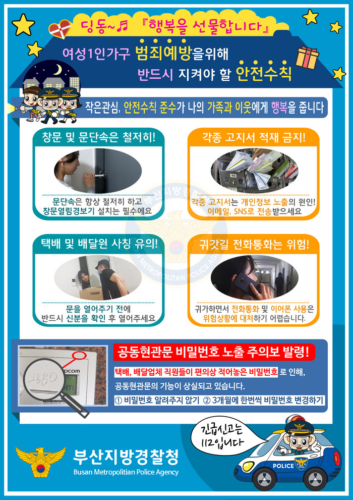 부산경찰 관계자는 "앞으로 대학가 등 원룸촌 일대에 범죄예방활동을 펼쳐 여성들이 안심하고 살아갈 수 있는 '범죄로 부터 안전한 부산'을 만들어 나가는데 힘쓰겠다“고 전했다.