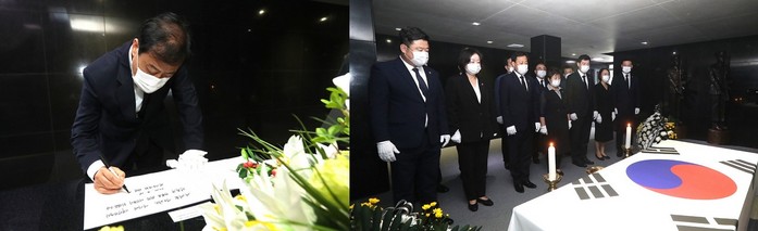 이어 현충탑 뒤편 위패실에 들러 분향한 뒤 방명록에 ‘세계를 선도하는 새 시대 대한민국의 행복과 번영을 위한 디딤돌이 되겠습니다’라는 글귀를 남겼다.