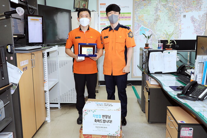 ▲ ‘2022년 8월 직원 사기 충전 캠페인’에 충무119 안전센터 소속 차범철 소방관을 선정, 감사패와 포상을 지급했다. 중부소방서 제공 |