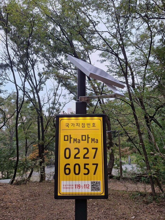 국가지점번호판은 국토 및 해양을 10m 단위 격자형으로 나눈 국가지점번호를 현장에서 쉽게 확인할 수 있도록 제작된 위치표시 표지판으로, 도로명주소가 없는 산악·하천 지역에서도 긴급상황 발생 시 구조기관이 정확한 위치를 파악할 수 있게 돕는다.