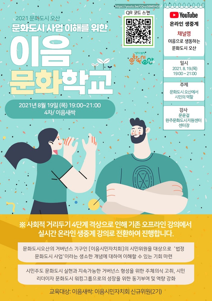 ‘이음시민자치회’의 신규 이음시민위원과 문화도시 오산에 관심 있는 시민을 대상으로 문화도시 시민 역량 및 거버넌스 강화를 위해 준비된 '이음문화학교 - 이음새싹' 네 번째 강의는 오는 19일 목요일 오후 7시에 문화도시 오산 공식 유튜브 채널 '이음으로 생동하는 문화도시 오산'을 통해 실시간 스트리밍 강의로 진행한다.