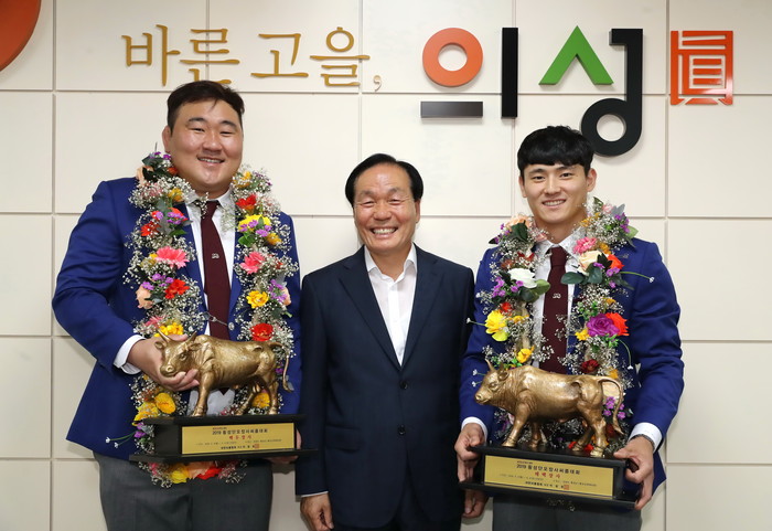 | ▲'2019 횡성단오장사씨름대회'에서 백두장사에 오른 차승진 선수(오른쪽)와 태백장상를 차지한 박정우 선수(왼쪽)가 김주수 군수와 기념촬영을 하고 있다.(의성군 제공) |