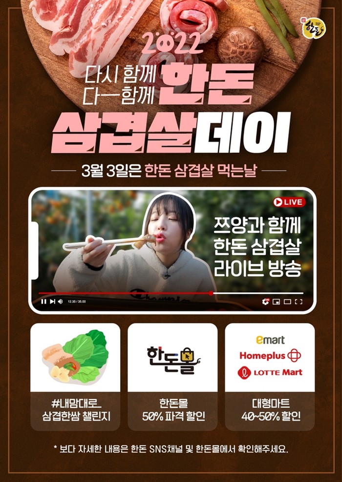한돈자조금관리위원회(이하 한돈자조금)가 3월 3일 삼겹살데이를 맞아 코로나19 장기화로 침체된 사회·경제적 분위기를 전환하고 국민 모두가 활력을 되찾길 바라는 염원을 담아 ‘다시 함께, 다 함께 2022 한돈 삼겹살데이’라는 슬로건을 걸고 다양한 프로모션을 전개한다.
