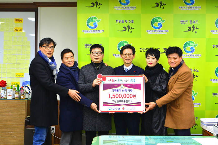 ▲유기상 군수(오른쪽에서 3번째)가 고창문화예술협회로부터 이웃돕기 성금을 전달받고 기념촬영을 하고 있다. |