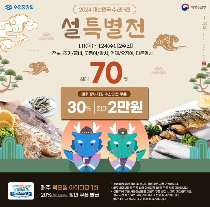 수협쇼핑은 ‘대한민국 수산대전 설 특별전’에 참가해 정부지원으로 매주 30%(한도 2만원) 할인쿠폰을 지급한다.