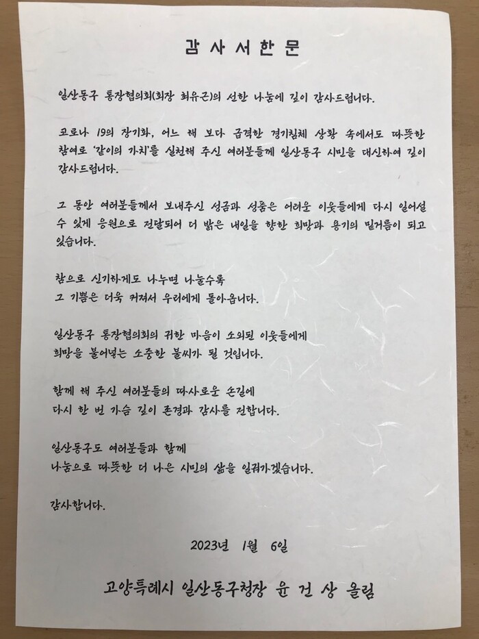 [로컬세계 = 이영원 기자]경기 고양특례시 일산동구는 작년 한 해 동안 저소득가정, 차상위가정, 한부모 가정 등 취약계층을 위해 나눔에 참여해 주신 13명의 개인·기업체·기관 등에 감사의 마음을 담은 감사 서한문을 발송했다고 6일 밝혔다.