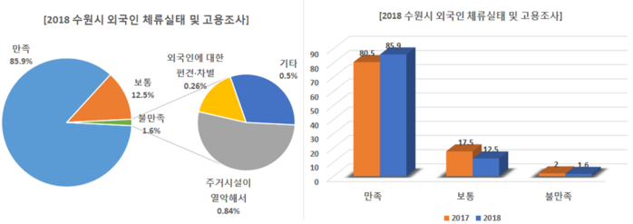 | ▲2018 수원시 외국인 체류 실태 및 고용 조사 통계자료. 왼쪽부터 ‘수원시 거주 만족도 및 불만족 사유’와 2017년 만족도 비교. |