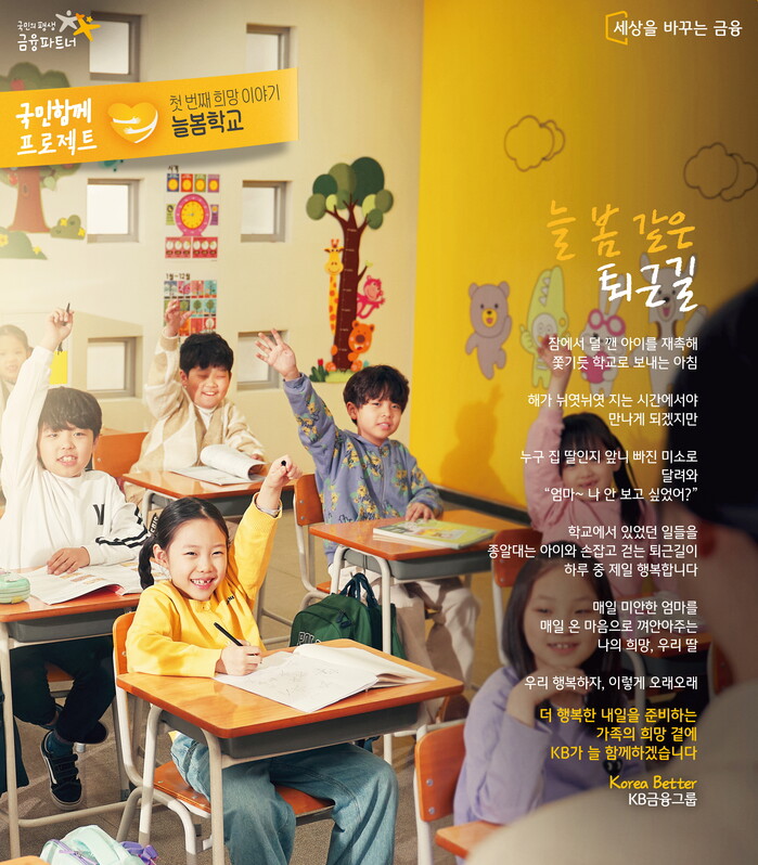 한편, KB국민은행은 어린이를 위한 다양한 사회공헌활동을 꾸준히 실천하고 있다. 대표사회공헌사업인 ‘KB Dream Wave 2030’의 일환으로 2017년부터 ‘KB지역아동센터’ 사업을 실시해 지역의 노후화된 유휴공간을 학습공간으로 리모델링하며 아이들의 쾌적하고 안전한 학습환경 조성에 노력하고 있다. 현재까지 전국 160개의 지역아동센터를 리모델링했으며, 올해부터는 지원규모를 연간 25개에서 60개로 대폭 확대해 추가 지원할 예정이다.