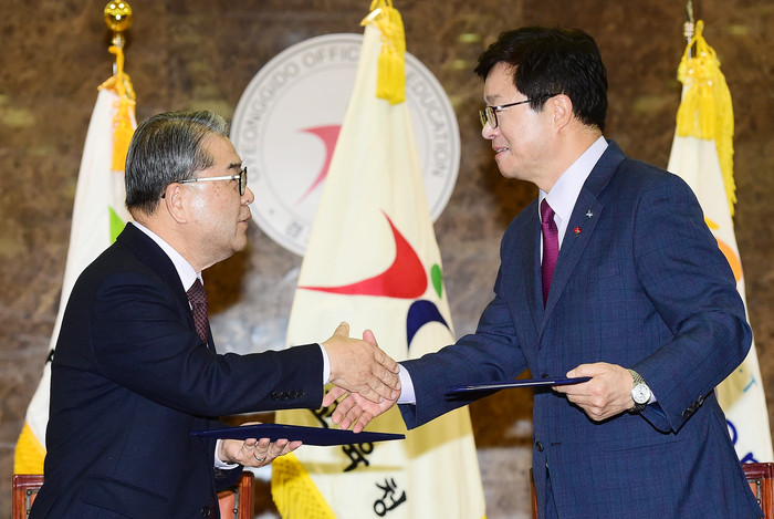 | ▲염태영 수원시장(오른쪽)과 이재정 경기도교육감(왼쪽)이 악수를 나누고 있다. |