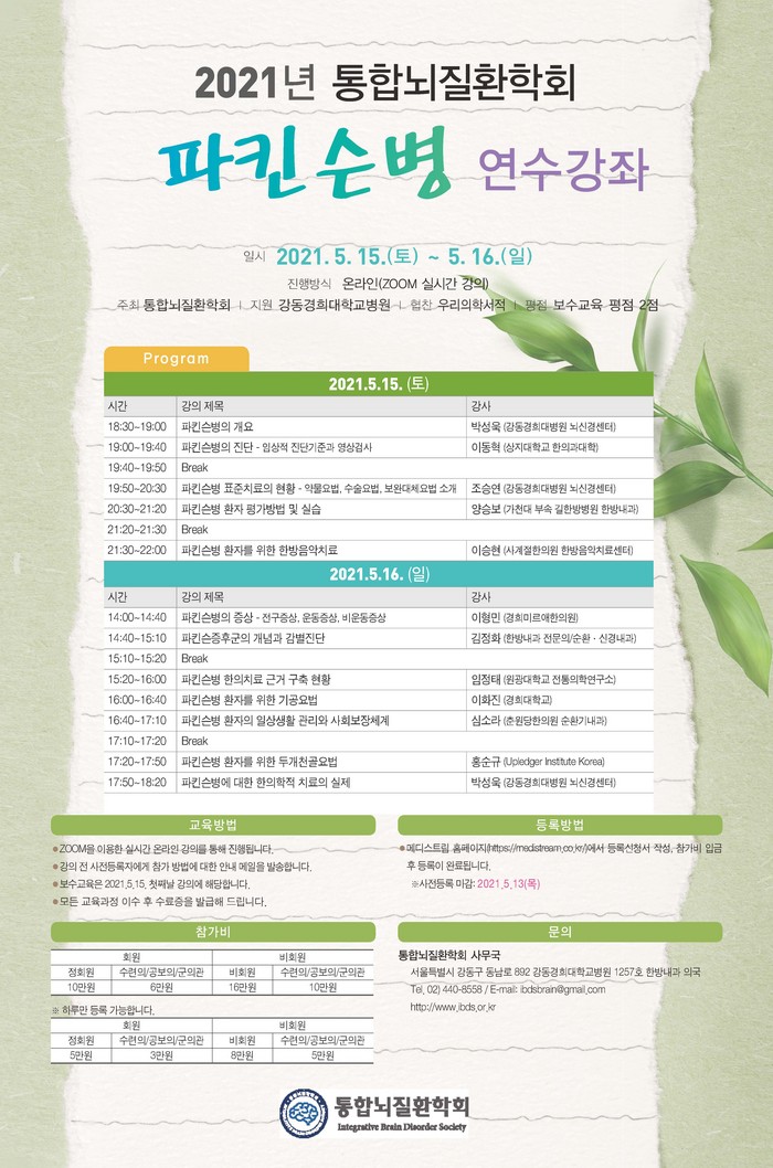 올해로 세 번째를 맞이하는 이번 연수강좌는 코로나19로 인해 오프라인 진행이 어려운 점을 고려해 실시간 화상 강의로 진행된다. 파킨슨병의 통합의학적 관리에 대한 저변 확대와 진료기반 구축을 위한 프로그램으로, 파킨슨병의 개요부터 진단 및 평가방법, 다각적인 치료적 접근법 등 임상 현장에서 파킨슨병을 치료, 관리하는데 활용할 수 있는 실제적인 내용으로 준비된다.
