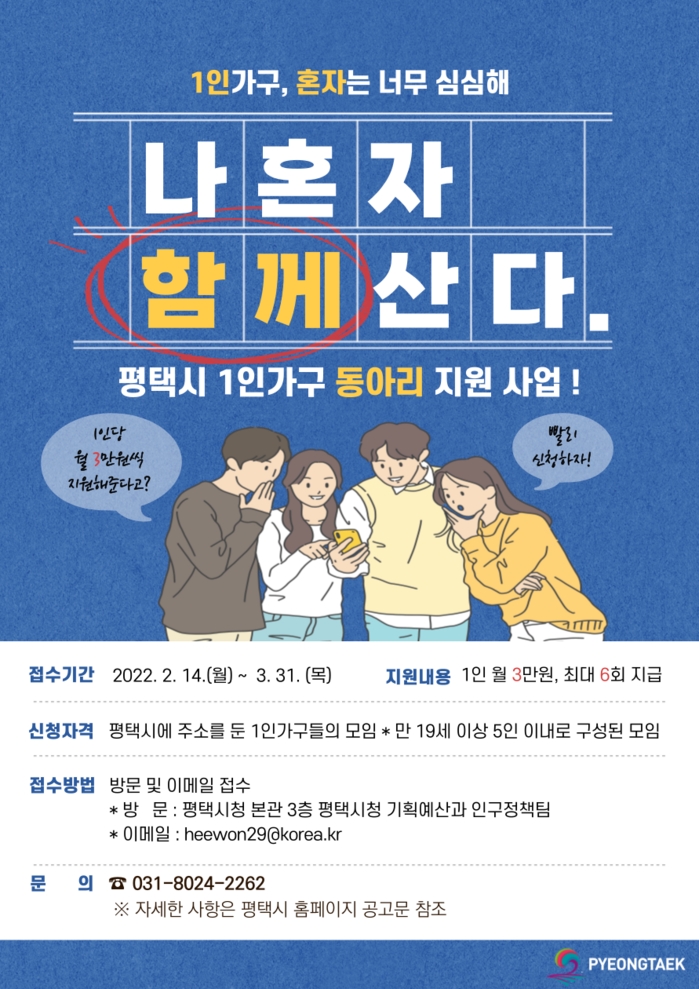 [로컬세계 김병민 기자]경기 평택시(시장 정장선)는 ‘나 혼자 ‘함께’ 산다’라는 주제로 1인가구 동아리를 2월 14일부터 3월 31일까지 모집한다.