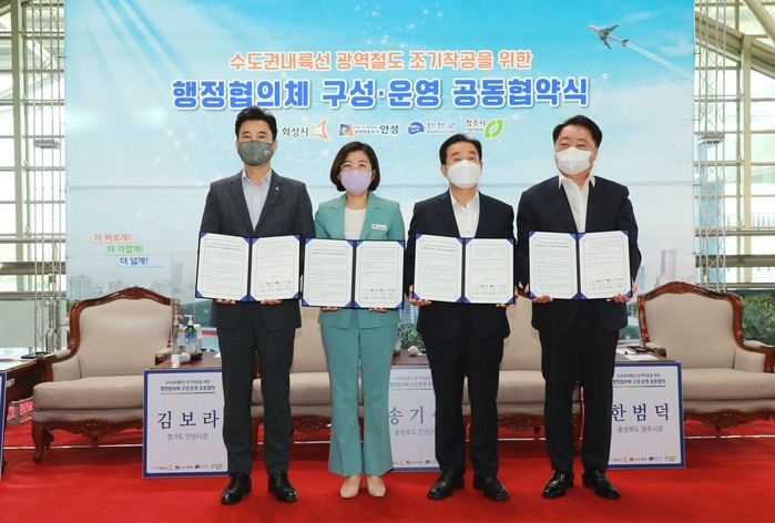 [로컬세계 김병민 기자]경기 안성시는 제4차 국가철도망 구축계획에 최종 반영된 수도권내륙선 광역철도의 조기 착공을 위해 청주국제공항에서 화성‧진천‧청주시와 공동으로업무 협약식을 개최했다고 9일 밝혔다.