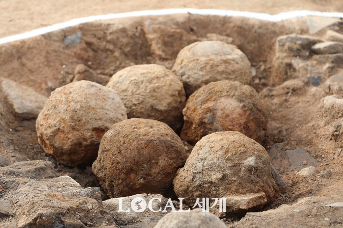 ▲지난해 11월 고창 무장현 관아와 읍성 군기고 일원에서 발견된 '비격진천뢰'(사진=로컬세계DB) |