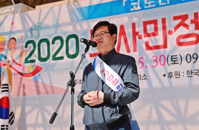 ▲30일 류태호 시장이 태백산 국립공원 당골광장에서 열린 '2020 태백시 노사민정 한마음 화합 결의대회'에서 인사말을 하고 있다.(태백시 제공) |