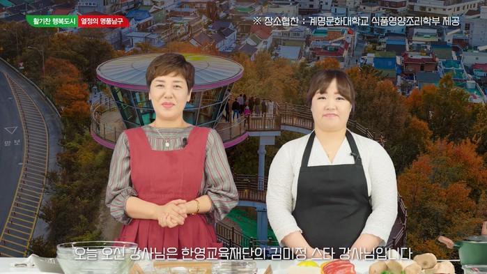 이번 요리교실 영상 콘텐츠 제작에는 ㈜한영교육재단에서 창업컨설팅 교육을 맡고 있는 김미정 강사와 송민선 남구 외식업지부장이 진행하였으며, 계명문화대 겸임교수이자 유튜버 ‘요들행님’ 박상철교수가 게스트로 참여하여 재미를 더했다.