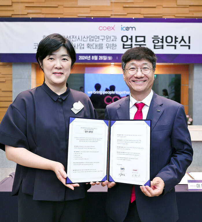 코엑스(사장 이동기)와 한국컨벤션전시산업연구원(원장 윤은주, 이하 ICEM)는 26일 오후 삼성동 코엑스 VIP룸에서 지역별로 검토되고 있는 전시컨벤션센터와 유니크 베뉴들을 대상으로 전문 컨설팅을 지원키로 하고 업무협약을 체결했다.