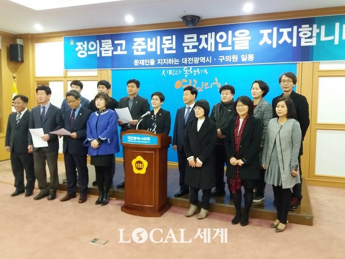 문 후보지지 대전시·구의원은 다음과 같다. ▲대전시의원=구미경, 권중순, 김인식, 김종천, 박상숙, 박정현, 박혜련, 전문학, 황인호 ▲동구의원=박민자, 이나영 ▲중구의원=류수열, 오인애, 육상래 ▲서구의원=김영미, 김창관, 류명현, 이광복, 이선용, 전명자, 장진섭, 최규, 최치상, 홍준기 ▲대덕구의원=문성원, 박종래, 서미경, 이금자, 이세형