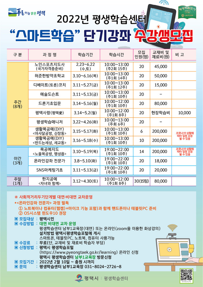 [로컬세계 김병민 기자]경기 평택시평생학습센터는 스마트한 시민성장을 위한 '스마트학습' 단기강좌 11개 강좌에 대해 지난 10일부터 수강생모집에 들어갔다고 14일 밝혔다.