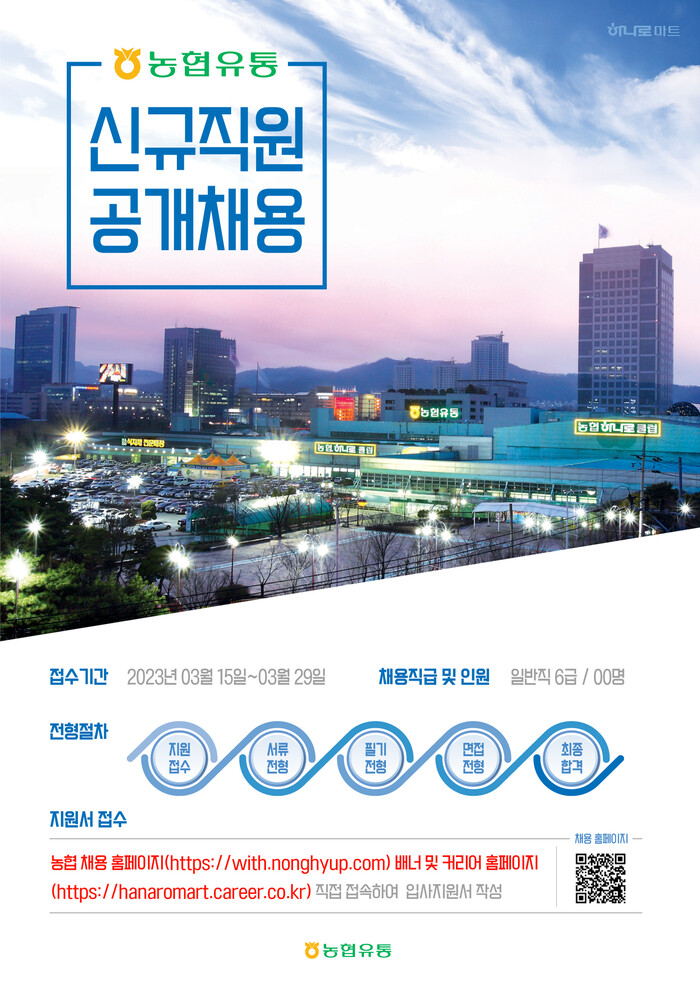 농식품 전문매장 농협 하나로마트를 운영하고 있는 농협유통(대표이사 신영호)은 일자리 창출과 우수 인재 확보를 위해 2023년도 상반기 6급(일반직) 신규직원 채용에 나선다.