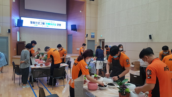 이번 프로그램은 소방재난본부에서 지원하는 힐링프로그 램의 일환으로 전문 원예치료사 방문지도로 ‘식물을 통한 오감 자극으로 불안과 긴장완화, 손가락 움직임을 통한 소근육 발달’에 도움을 주는 소방공무원 직접 참여형 프로그램이다.