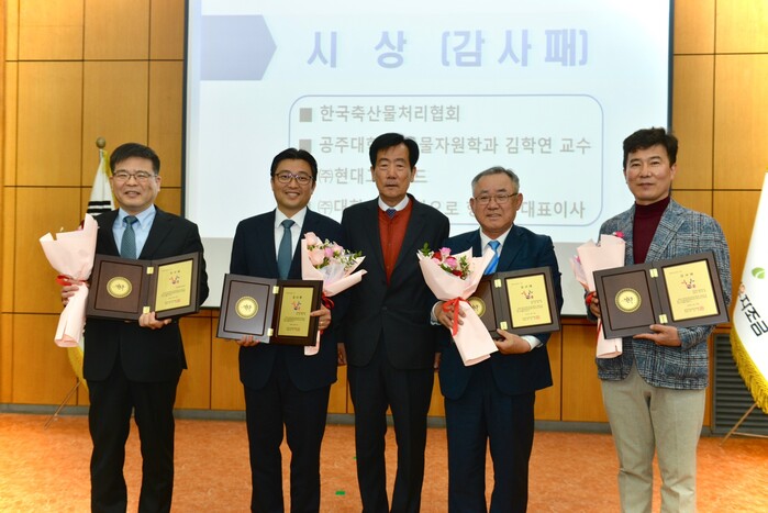 이번에 한우소비 활성화 및 거출에 기여한 공로로 감사패를 받은 수상자는 ▲한국축산물처리협회 김명규 회장 ▲공주대학교 동물자원학과 김학연 교수 ▲(주)현대그린푸드 ▲(주)대한사람대한으로 형성길 대표이사 등 총 3명과 1개 기업이다.