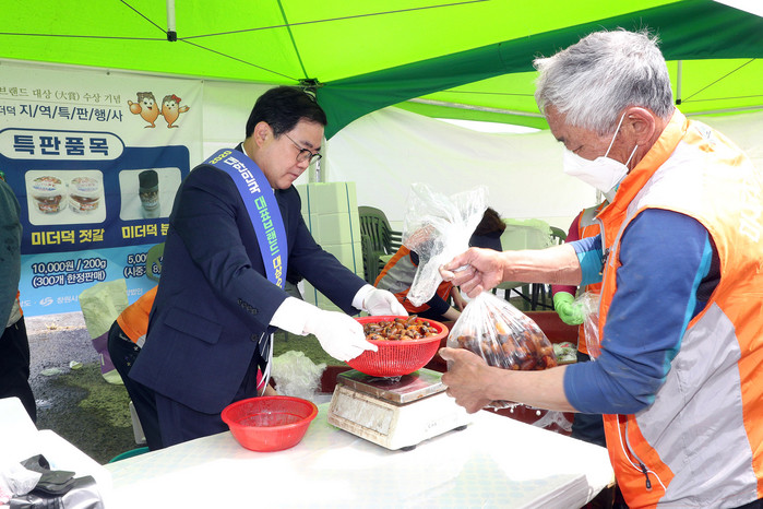 | ▲허성무 시장(왼쪽)이 창원진동미더덕 지역 특판행사에 참여하고 있다.(창원시 제공) |