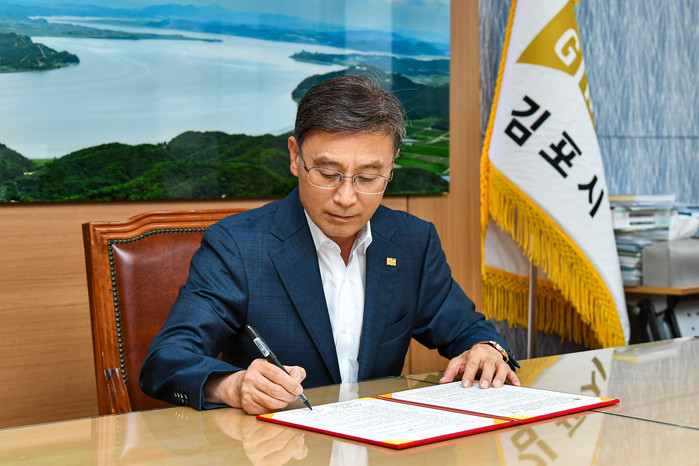 | ▲정하영 김포시장이 한강과 염하강 철책 철거사업 협약서에 서명하고 있다. 김포시 제공 |