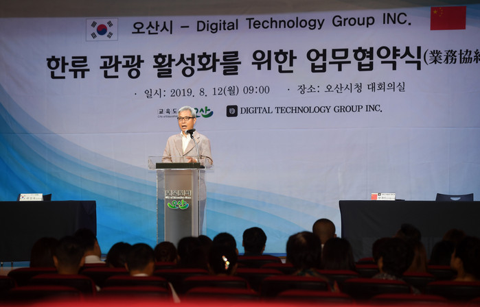 곽상욱 오산시장은 12일 오산시청 대회의실에서 글로벌 금융·관광서비스 제공 전문 기업인 디지털테크놀로지그룹 왕루이 이사 일행과 한류관광 활성화를 위한 협약(MOU)을 체결했다.