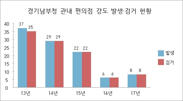 경기남부경찰청에 따르면 2013년 이후 감소 추세였던 편의점 강력사건이 지난해 6건이었지만 올해 5월 말 기준 8건으로 늘었다.