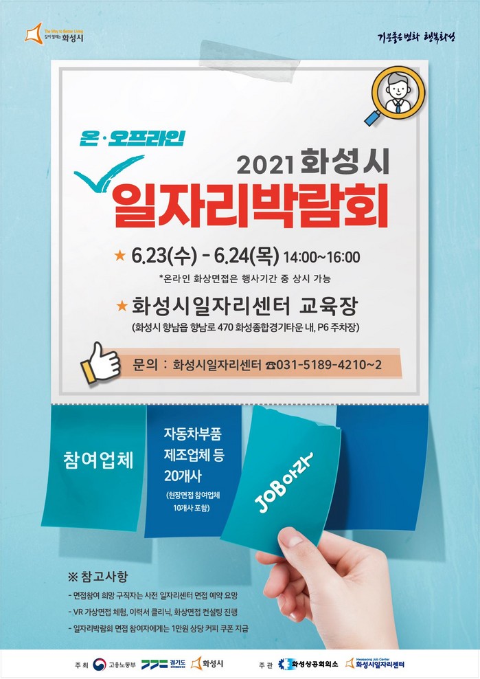 이번 ‘2021년 화성시 온·오프라인 일자리박람회’는 고용노동부, 경기도, 화성시가 주최하고 화성상공회의소, 화성시일자리센터가 주관한다.