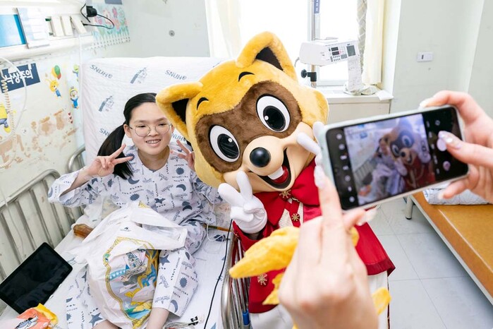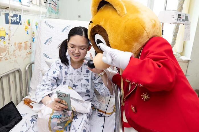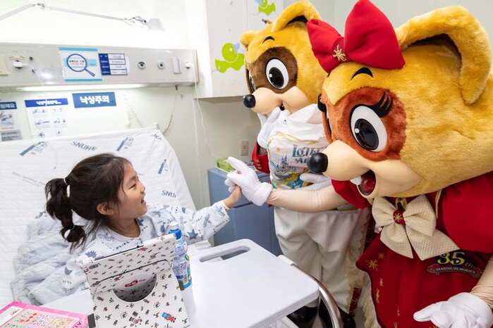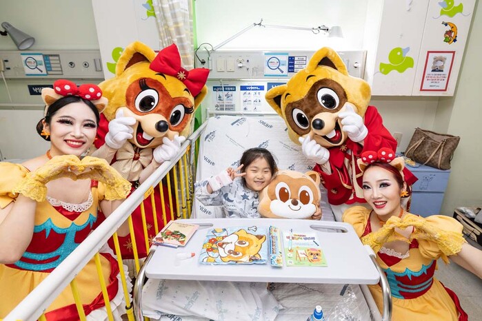 이날 롯데월드 대표 캐릭터 로티, 로리와 공연 연기자들이 병실에서 오랜 시간을 보내야하는 환아들의 심리적 안정에 도움이 되는 캐릭터 쿠션, 색칠놀이 워크북 등 정성스럽게 준비한 캐릭터 선물을 전달했다.