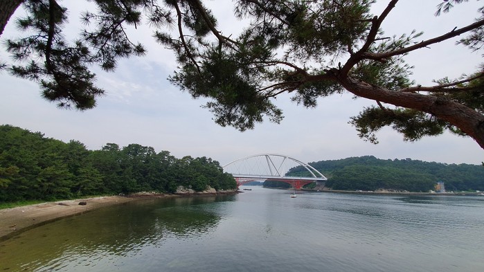 | ▲구산면과 저도를 잇는 연륙교. 빨간 다리가 콰이강의 다리다. |