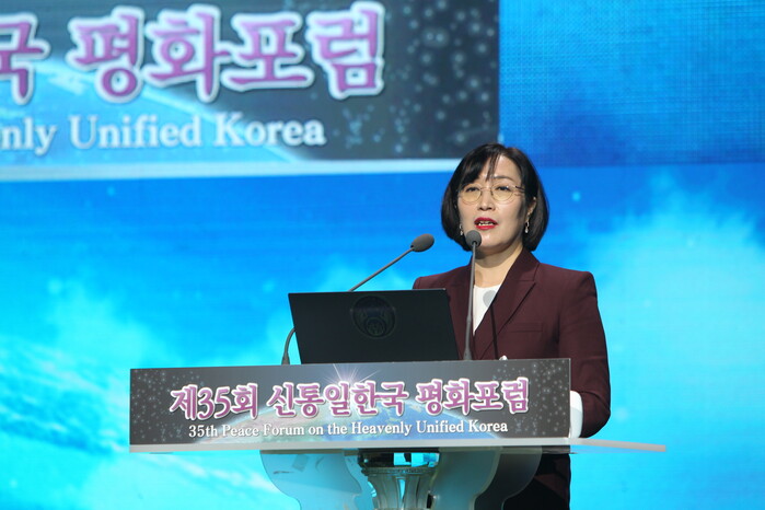 ▲ 김민지 선문대 교수가 11일 열린 35회 신통일한국 평화포럼에서 ‘공영주의로 본 한국 청년 정치’를 주제로 강연하고 있다. |