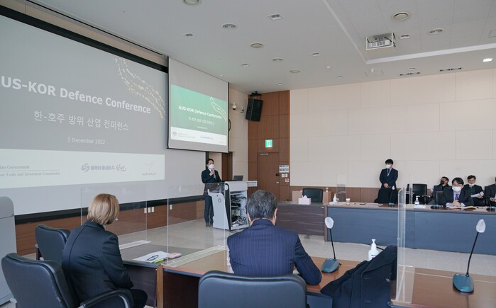 이날 오전 해군사관학교 학술정보원 대회의실에서 열린 ‘한-호주 방산 협력 컨퍼런스’는, 창원시와 주한호주대사관 무역투자대표부(Austrade)가 주최하고 호주 방산시장 진출에 관심 있는 기업 임직원 70여명이 참석한 가운데, 호주의 획득 정책 및 현지화(AIC) 정책 소개, 호주 New South Wales 주와 Western Australia 주의 기업 지원 정책, 한화에어로스페이스의 호주진출 성공사례 발표 순으로 진행되어 한국과 호주의 방산 협력을 공고히 했다.