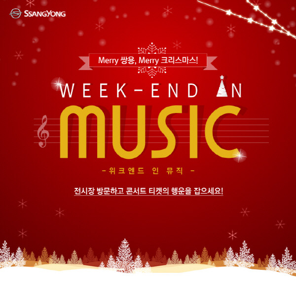 쌍용차는 ‘위크엔드 인 뮤직’을 통해 고객들에게 정상급 뮤지션들의 연말 콘서트 티켓 총 80매를 증정할 예정이다.