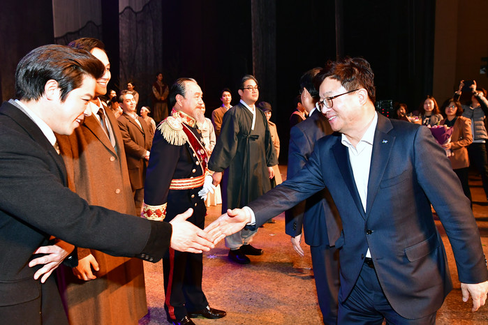 | ▲12일 공연 후 염태영 수원시장이 출연진들과 인사하고 있다.(수원시 제공) |