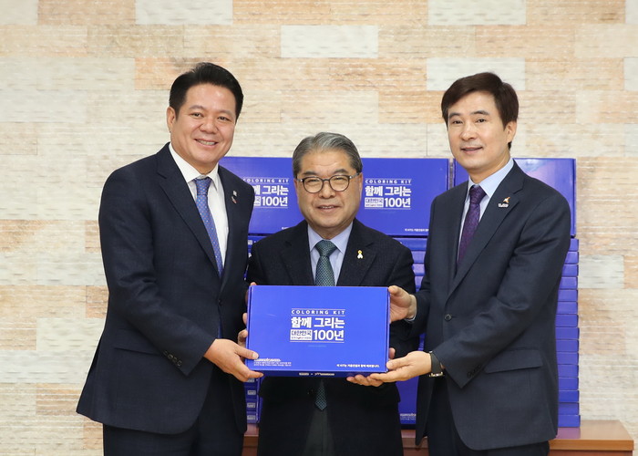 | ▲‘대한민국 100년 키트’ 전달식 기념촬영 모습. 사진은 왼쪽부터 최대호 상임조직위원장, 이재정 경기도교육감, 서철모 상임조직위원장. |